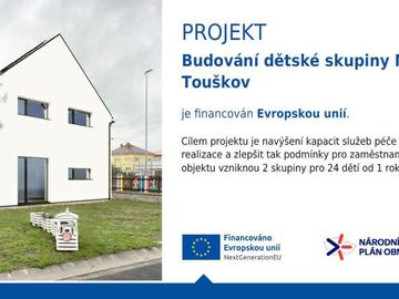 Město Touškov získalo finanční podporu z Národního plánu obnovy na vybudování objektu pro dětské skupiny. Objekt bude dvoupodlažní a bude sloužit pouze pro účely provozu služby dětských skupin. Realizací projektu dojde ke vzniku 2 dětských skupin o kapacitě 2x12, tedy celkem 24 dětí. Dotace připadající na výdaje bez DPH bude financována z Nástroje pro oživení a odolnost. Podíl připadající na DPH pak bude financován ze státního rozpočtu.